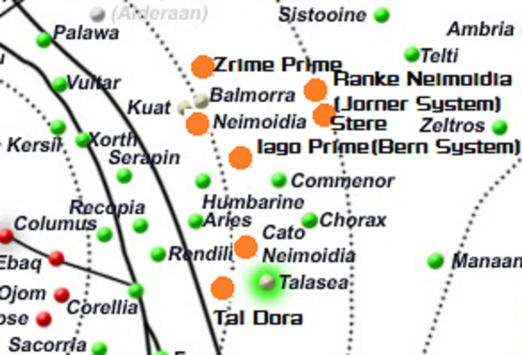 The 4 new Purse Worlds discovered on 18 ABY are the central core on the south while the north has the older Purse Worlds alongside Pure Neimoidia.In the middle we ca see the other two planets that pledged to this goverment Stere and Zrime Prime.